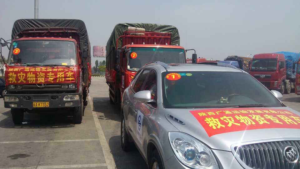 陜西廣通運輸發(fā)展有限公司救援物資車隊于4月25日凌晨三點左右,抵達雅安市雨城區(qū)多營鎮(zhèn)的物資集中配送點。本次救援物資運送車隊由五輛大卡組成,共運送了價值十多萬元的救災(zāi)急需物資四十余噸;行程八百五十公里;用時十八小時。到達雅安物資集中配送點后,當?shù)毓ど滩块T對這批物資進行了檢驗、登記。經(jīng)過四小時的緊急卸載,車隊于中午十二點離開雅安。